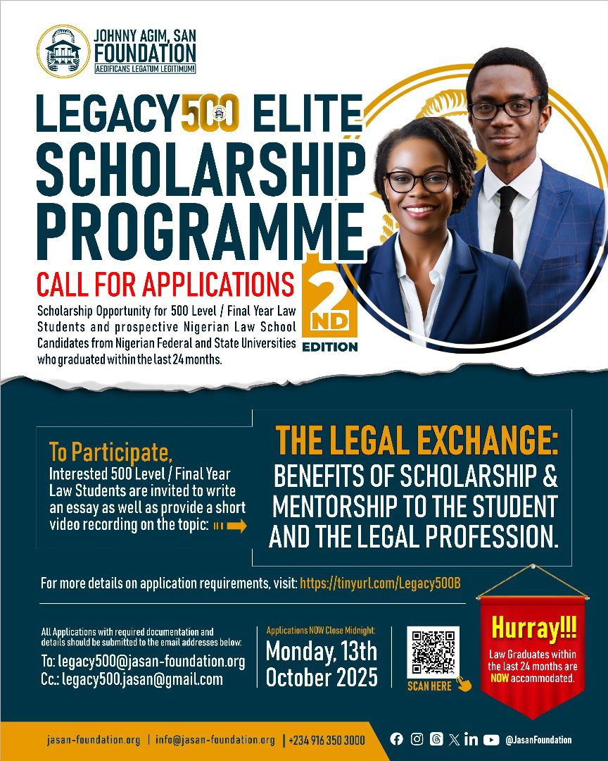The Johnny Agim, SAN Foundation [JASAN Foundation] is pleased to announce the extension of the timeline for the Close of Applications for the 2nd Edition of its #Legacy500 Elite Mentees Sponsorship/Scholarship Programme and Essay Competition to accommodate more applicants.